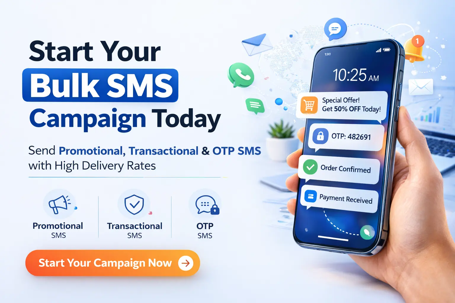 Promotional SMS is used to send marketing messages such as discounts, offers, and product promotions. Transactional SMS sends important notifications, such as order confirmations, payment alerts, and delivery updates. OTP SMS sends a one-time password to verify a user’s identity during login or secure transactions. Yes. Bulk SMS marketing is highly effective because messages are delivered instantly and have a high open rate.